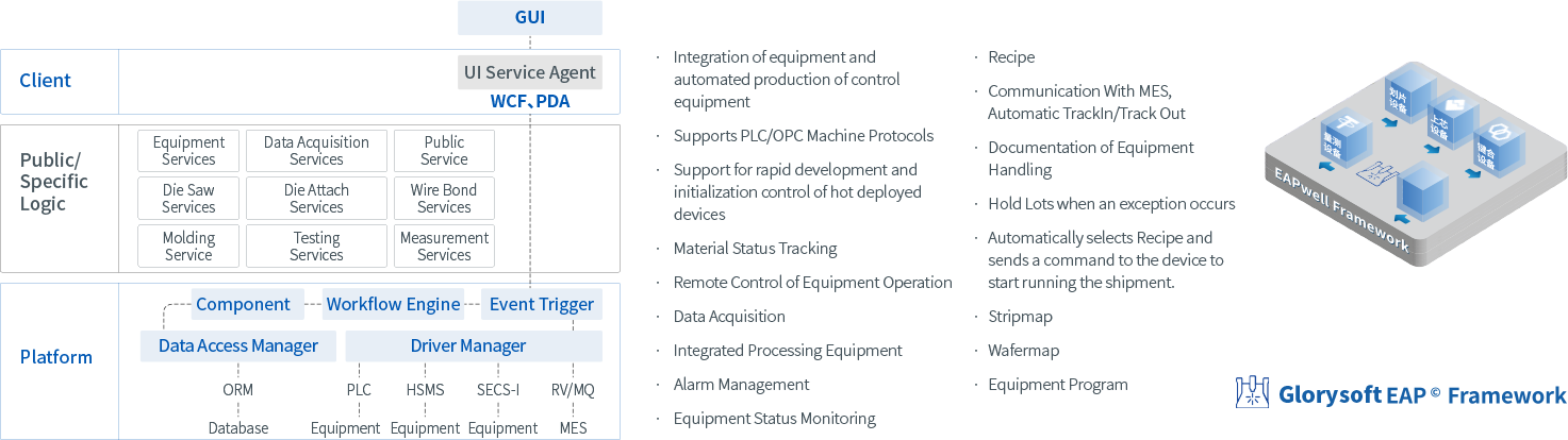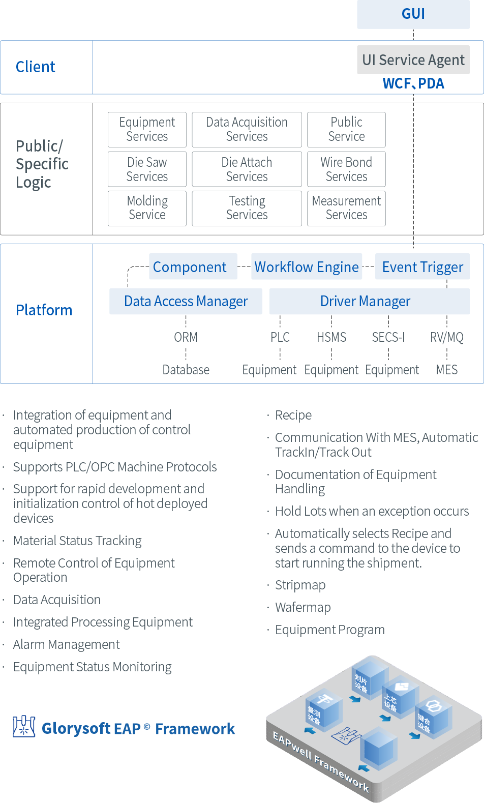 GlorysoftEAP©is a factory automation system that caters to semiconductor front-end and sealing and testing, bridging the gap between semiconductor equipment and upstream systems.