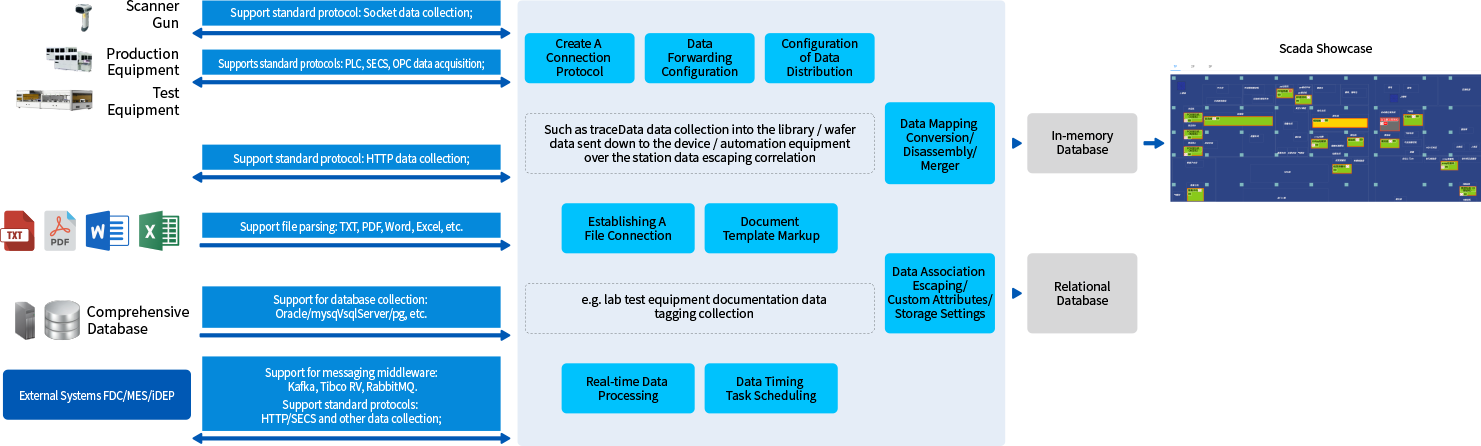 Data connection protocol settings: can be configured to achieve PLC (OPC), SECS, HTTP, SOCKET, KAFKA, RV, RabbitMQ these protocols, to establish a connection; and can control the collection frequency.
